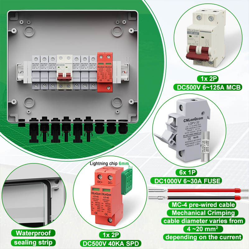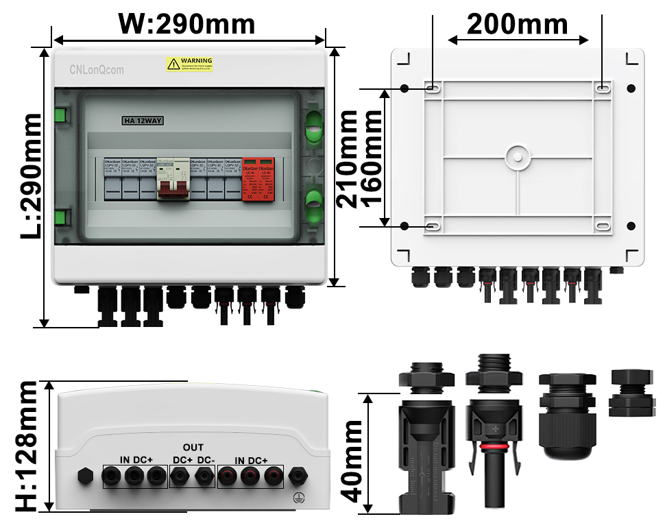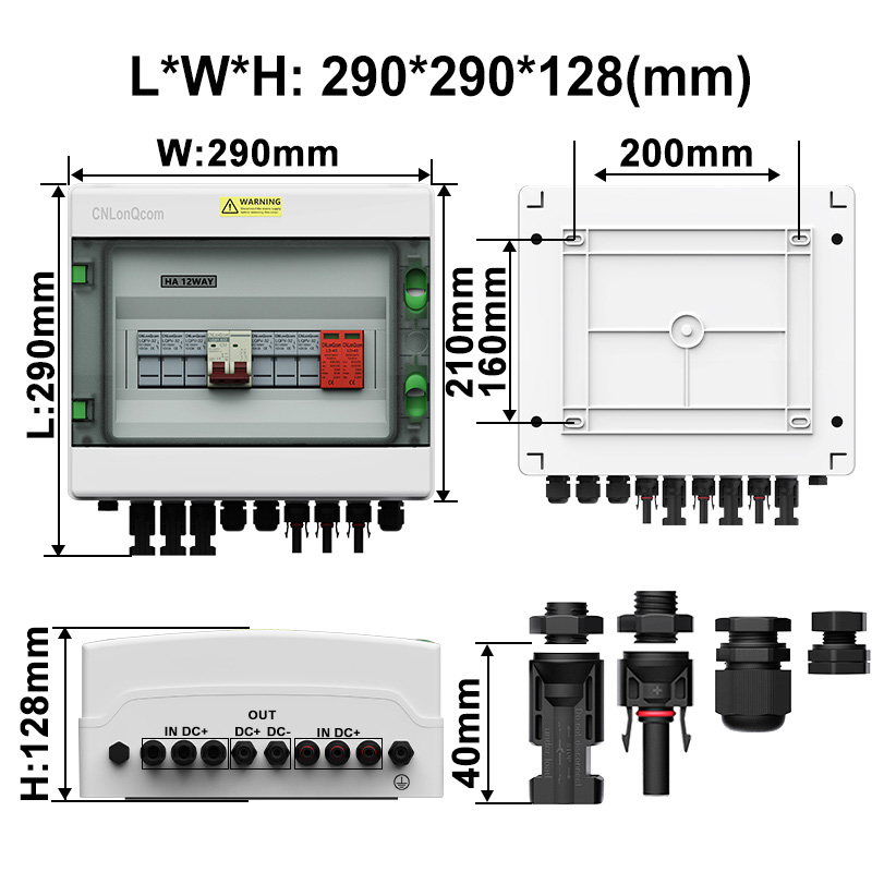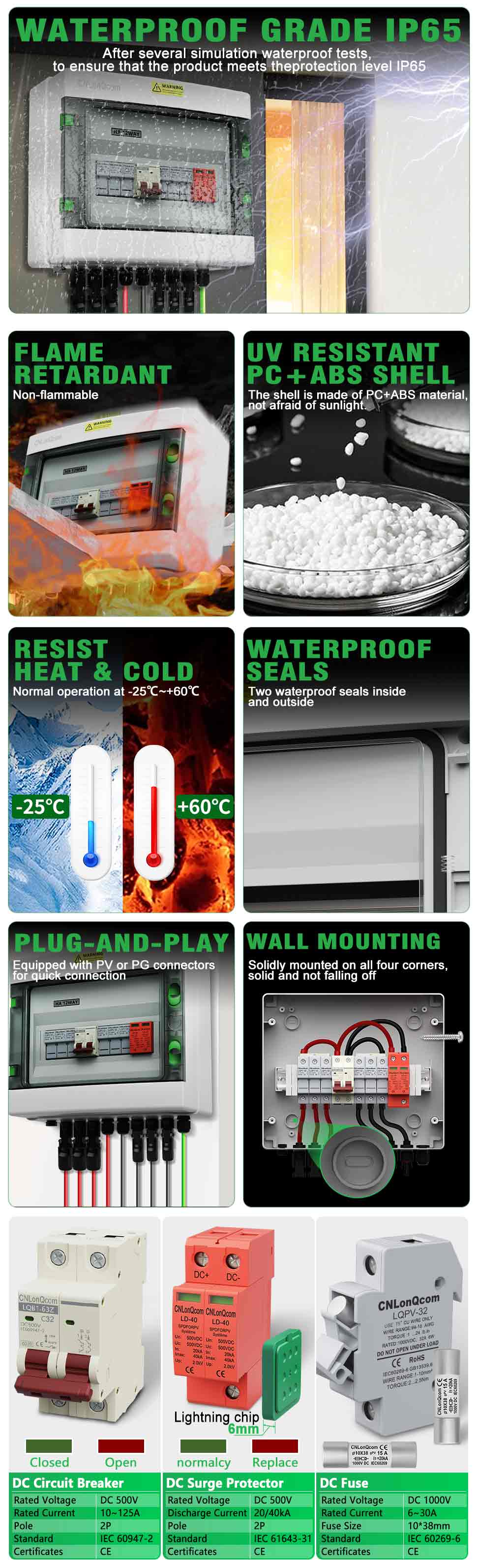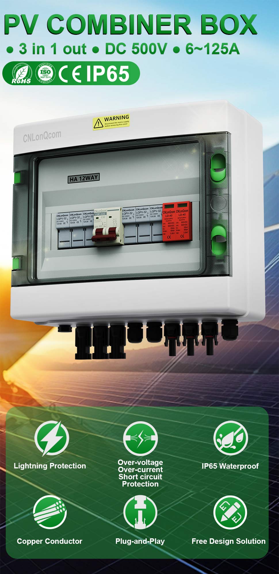 CNLONQCOM: s HA Series Plastic PV Combiner Box 3 in 1 OUT DC500V/600V/800V används huvudsakligen för att skydda PV-system och används ofta i rutnät eller nätanslutna system. Som PV -paneler, husbil, båt, utomhus PV, hushåll, etc.