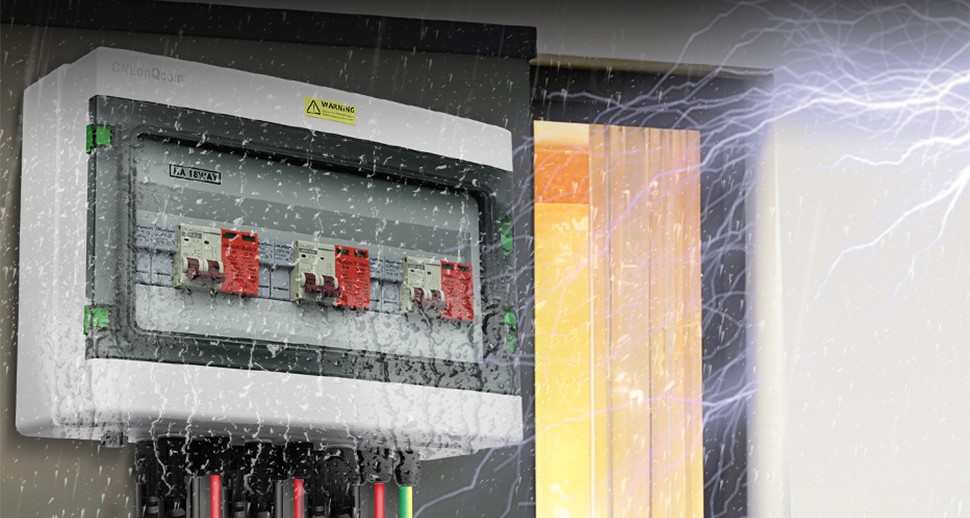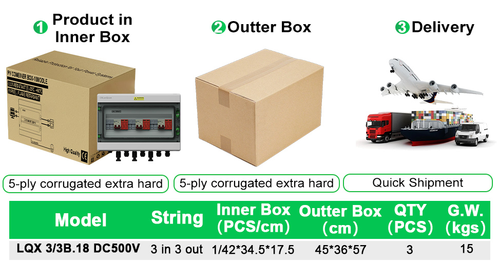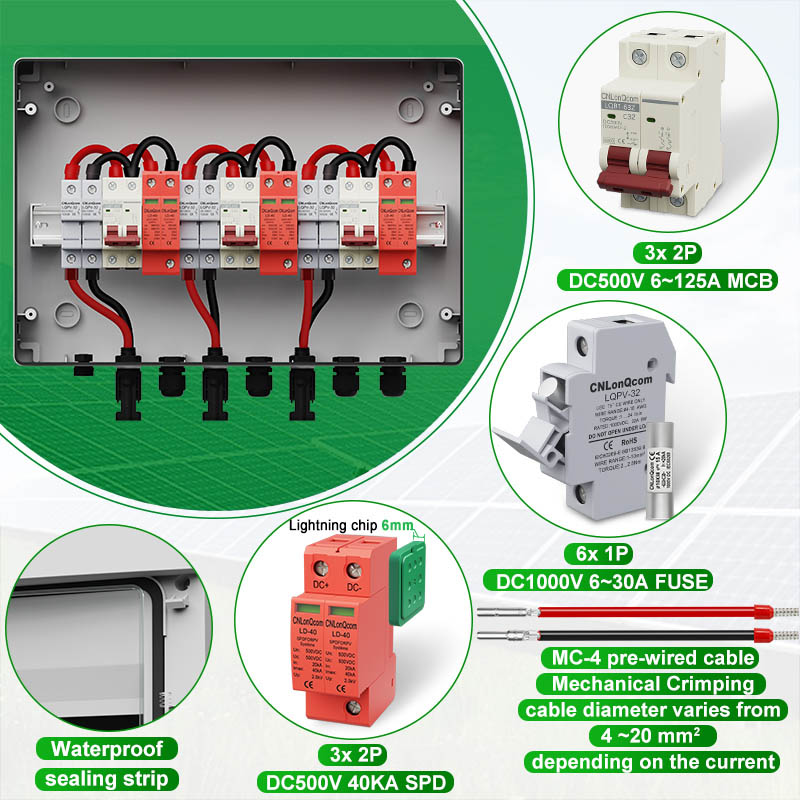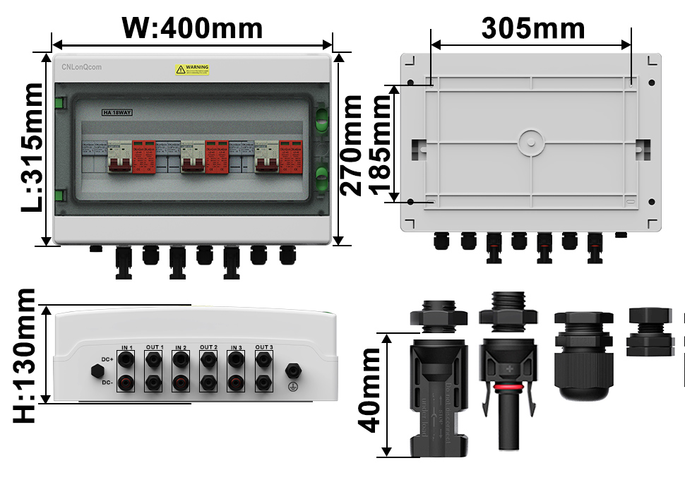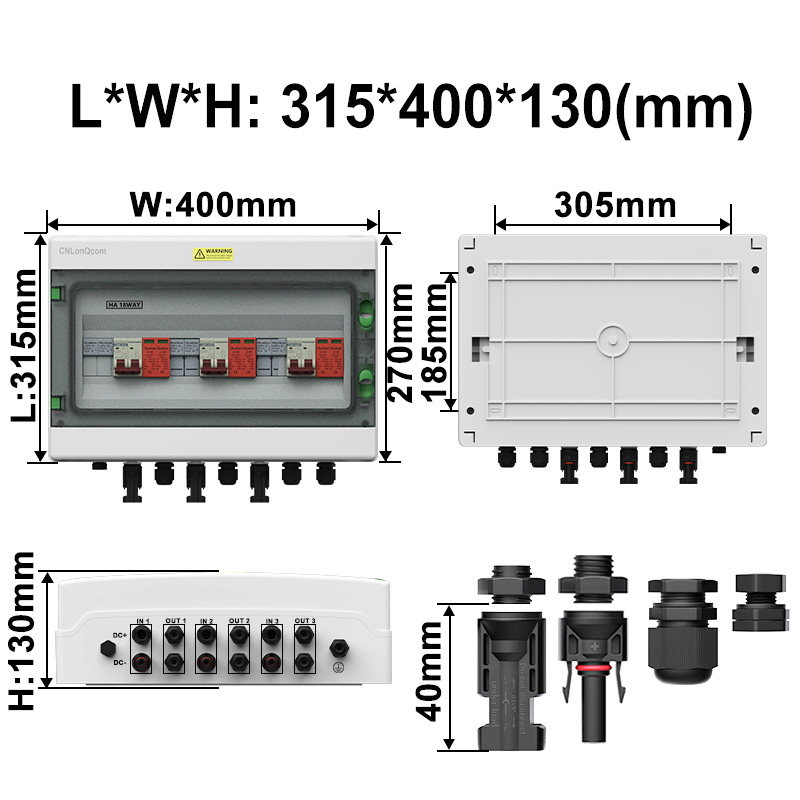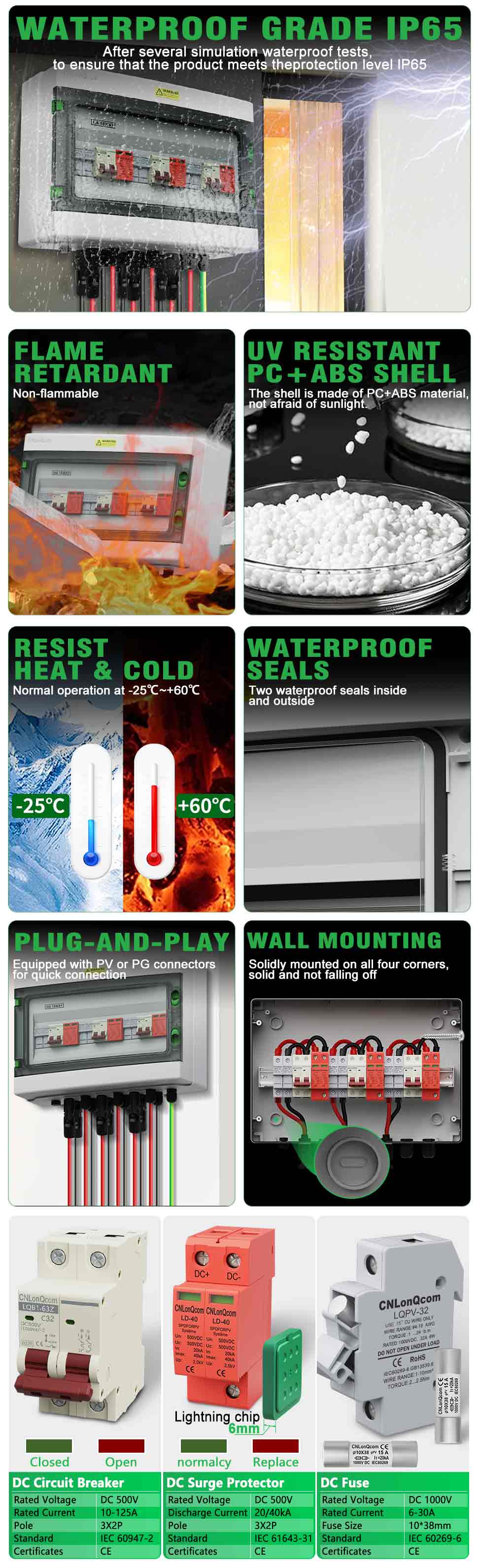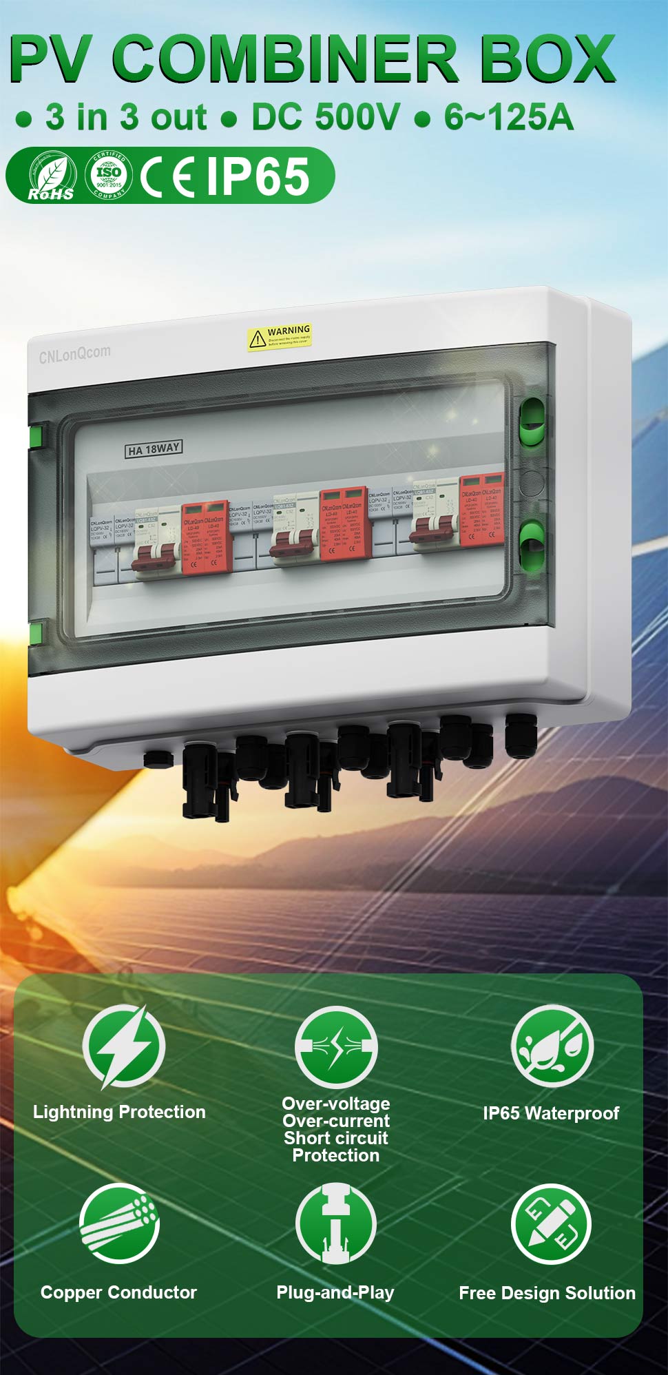 CNLONQCOM: s HA Series Plastic PV Combiner Box 3 i 3 OUT DC500V har ett PC+ABS -vattentätt fodral med förseglad konstruktion, överbelastningsskydd, skyddsskydd, överspänning, damm, fukt och blixtskydd.