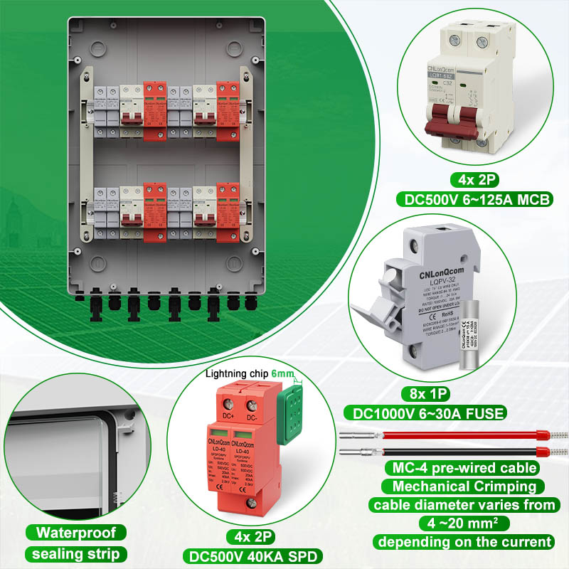 CNLONQCOM: s HA Series Plastic PV Combiner Box 4 i 4 OUT DC500V/600V/800V används huvudsakligen för att skydda PV-system och används ofta i rutnät eller nätanslutna system. Som PV -paneler, husbil, båt, utomhus PV, hushåll, etc.